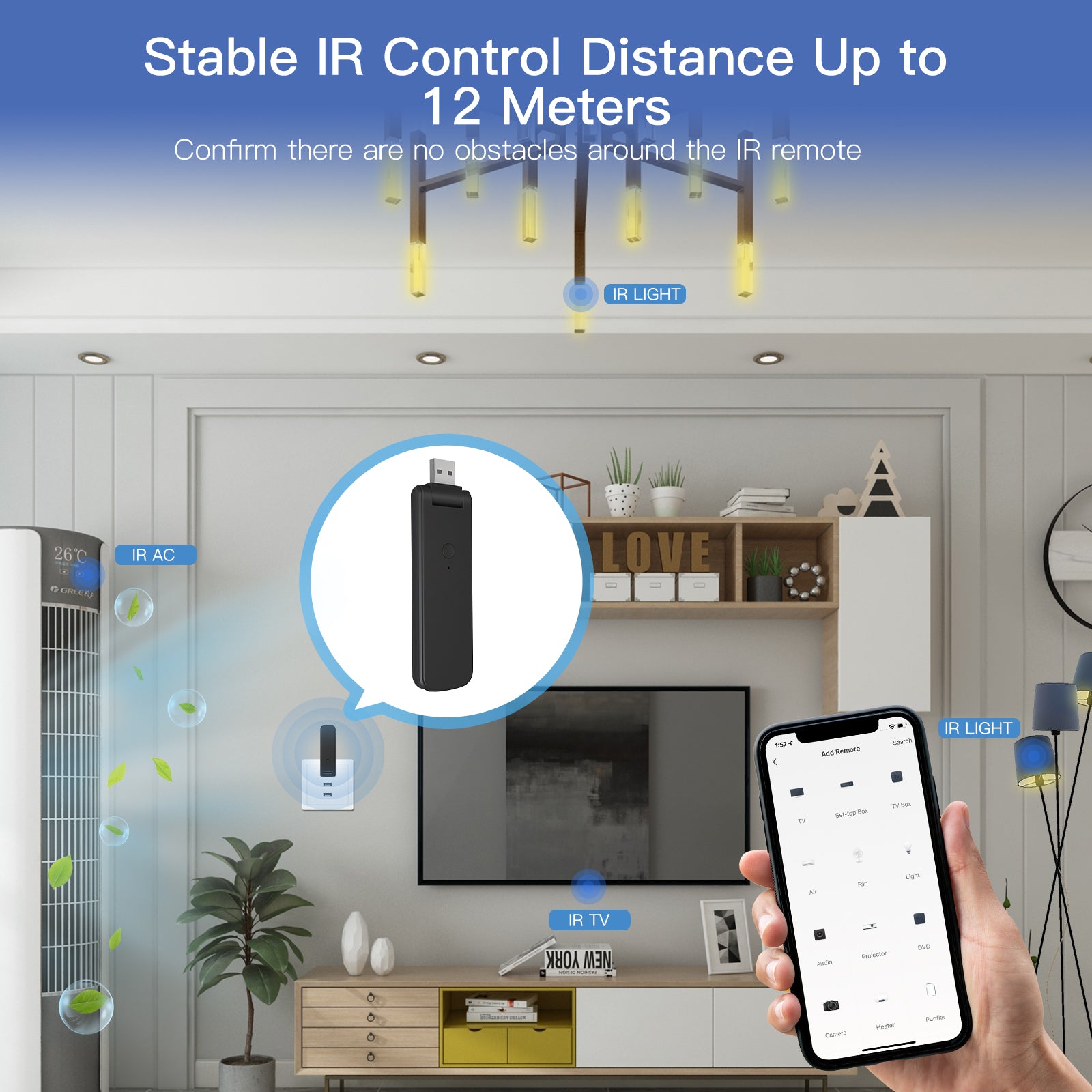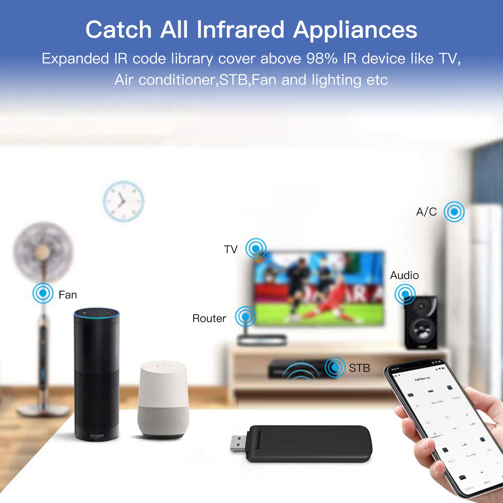 Universal Compatibility:Expanded IR code library cover above 98%, saying goodbye to remote controls of the IR home appliances such as TV, Air-con,TV box, light, Fan, Audio, etc. You can remotely control the devices with the tap of your finger on the mobile APP with its 12 meters infrared control distance and 360¡ãomnidirectional transmit signal coverage, also you can control RF-enabled devices like curtain, roller shutter, garage door, RF switch, etc. by this streamline design USB IR+RF remote.
