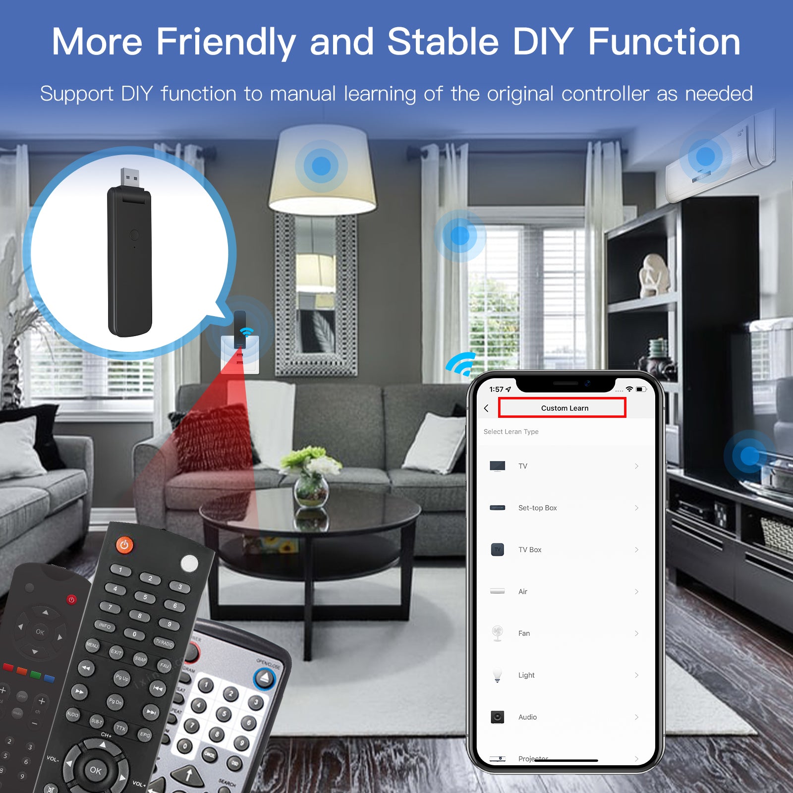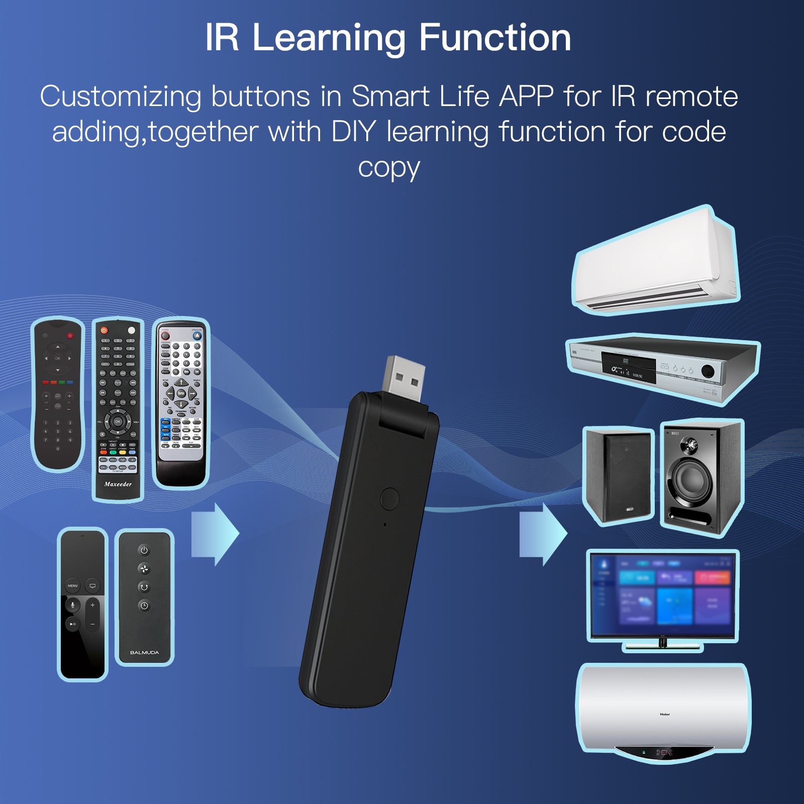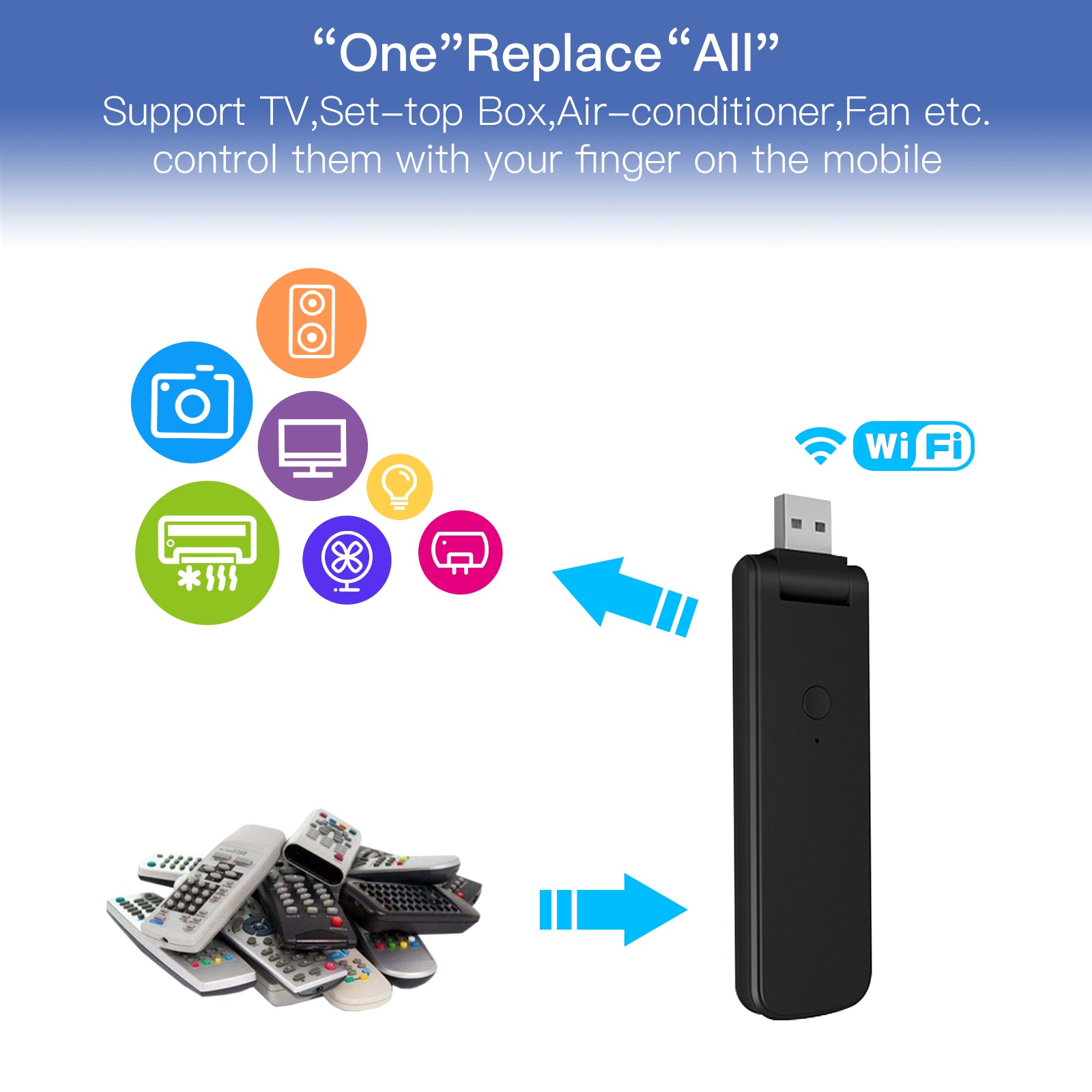 Newest Smart IR+RF Controller with 210¡ãRotate USB Design: All-in-one IR and RF remote control Infrared smart devices for controlling air conditioners, TVs, fans, DVDs, STBs, TV BOXes etc, and even RF appliances as RF light,RF switch, RF roller blinds etc..It can store thousands of IR codes with mini 210¡ãUSB design that can be used on a wall socket, on a computer, on a power bank, on a plug, and even portable for more flexible usage than the old version.